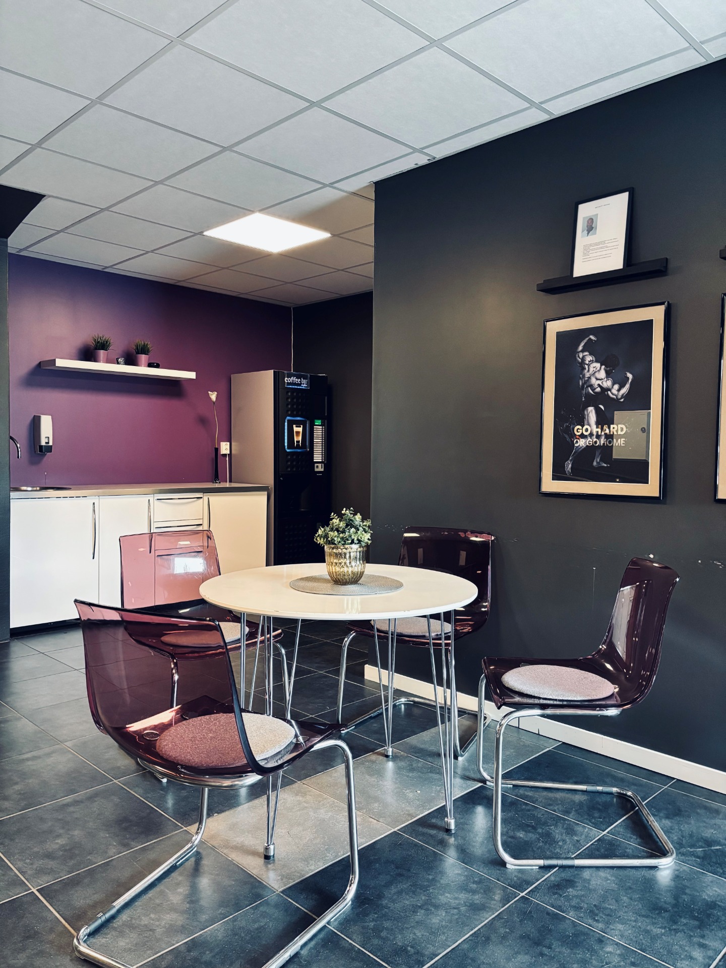 Stort kaféområde som innbyr til sosiale samtaler før og etter trening. I kaféen har du tilgang til kaffemaskin, kjøleskap, vask og oppvaskmaskin.